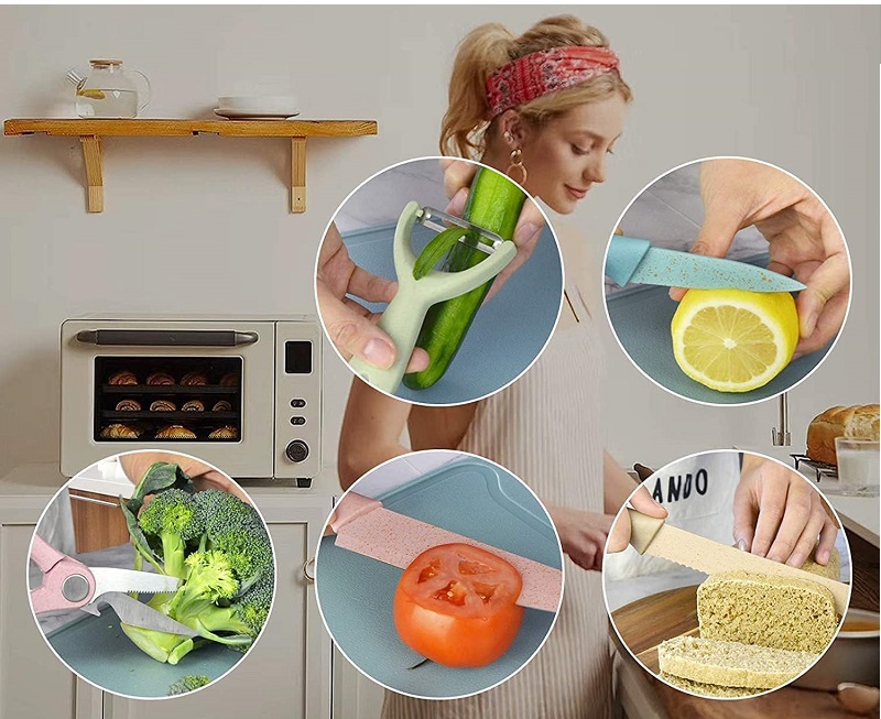 Además, el filo de los cuchillos y la tijera están elaborados con acero inoxidable para que el corte de los alimentos sea suave y fino.